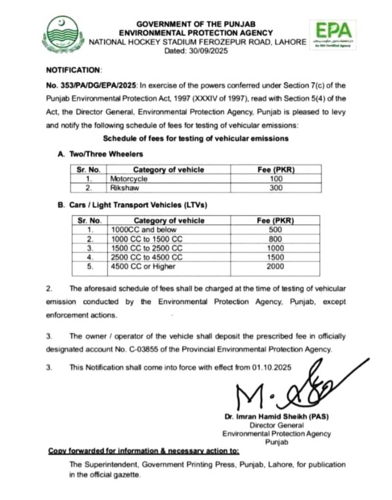 لاہور: پنجاب ایئر کوالٹی ایجنسی (ای پی اے) نے گاڑیوں کے اخراج ٹیسٹ کے لیے فیس کا نیا شیڈول جاری کر دیا ہے۔