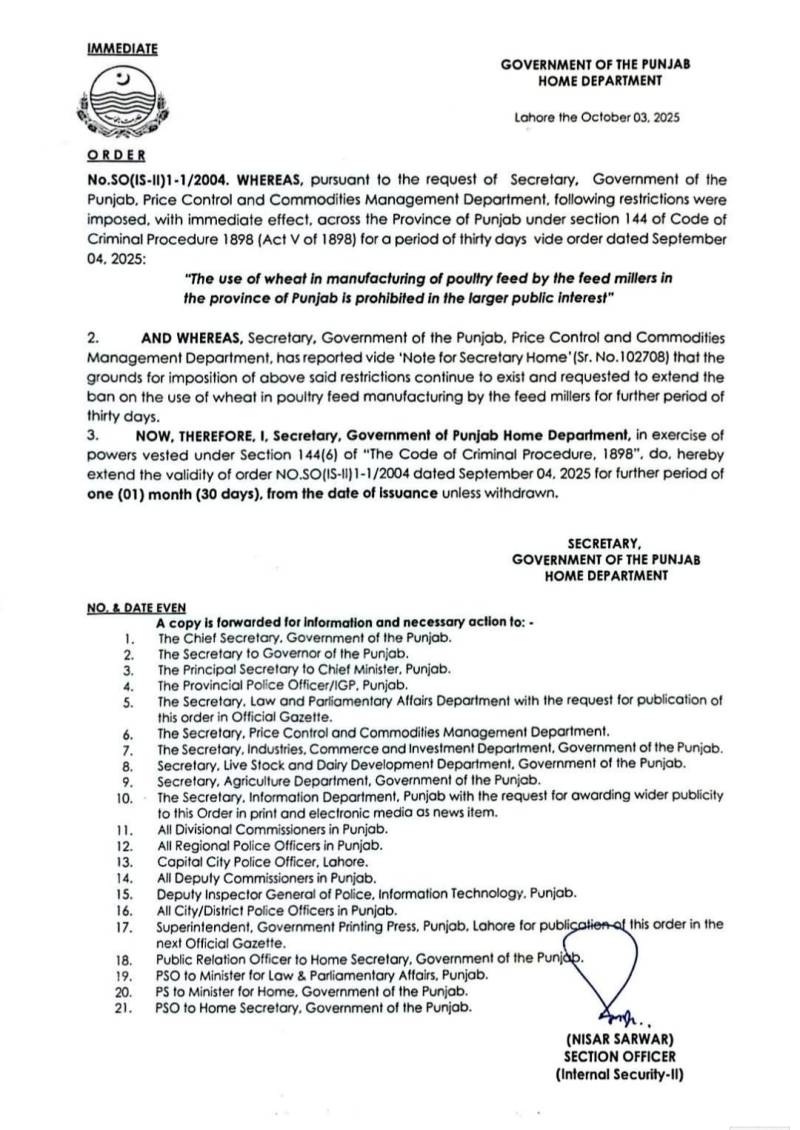 سینئر رپورٹر نمائندہ لاہور رنگ ادریس شیخ کے مطابق سیکرٹری داخلہ کے حکم کے مطابق گندم صرف فلور ملز میں آٹا بنانے کے لیے استعمال کی جائے گی۔ پنجاب حکومت نے فیڈ ملز میں گندم کے استعمال پر عائد